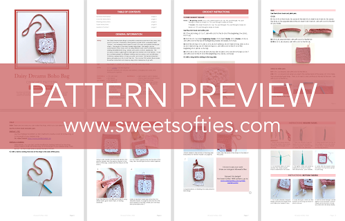 If you'd like to download the beautifully-formatted, ad-free, and easy-to-read PDF of the Daisy Dreams Boho Bag (see preview below), click here to purchase it for a small fee in my Ravelry shop or Etsy shop. Thank you for supporting Sweet Softies designs!